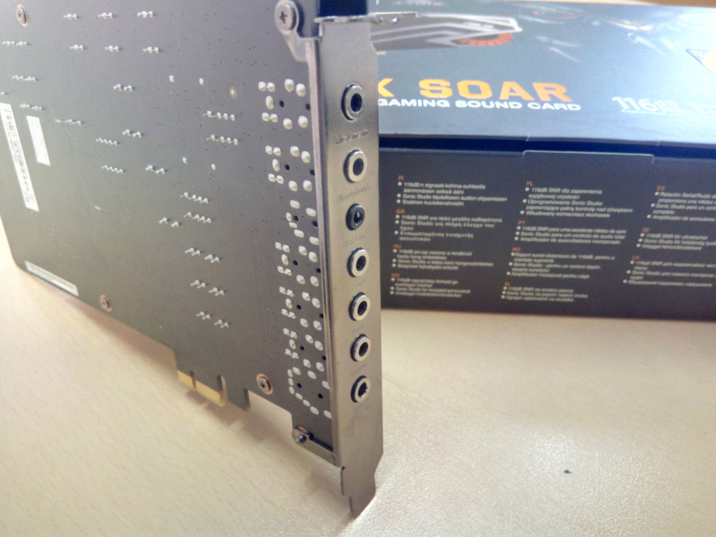 Звуковая карта выглядит достаточно стильно прежде всего из-за красиво оформленного наружного кожуха, который одновременно является пылезащитой, а также фирменного логотипа серии Strix, напоминающего глаз совы. К слову, этот элемент декора устройства подсвечивается ярким оранжевым цветом при подключении и во время работы звуковой карты. Даже при условии, что ASUS STRIX SOAR – внутренняя звуковая карта, такую не стыдно установить в корпус с акриловым окном – выглядеть она будет в любом случае стильно и красиво. Устройство подключается к ПК через слот PCI-E и требует для работы дополнительное питание 6pin, прямо как мощные высокопроизводительные видеокарты. При этом, карта достаточно габаритная и установить ее в низкопрофильный корпус навряд ли не получится, однако, это не кажется большой проблемой, учитывая, что звуковая карта относится к классу игровых, а геймеры редко используют малогабаритные корпуса для своих игровых систем. На задней панели звуковой карты имеется 7 разъемов, 5 x 3.5-мм из которых используются для подключения многоканальных аудиосистем и наушников, один комбинированный цифровой вход S/PDIF и еще один 3.5-мм является комбинированным линейным и микрофонным входом.