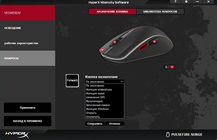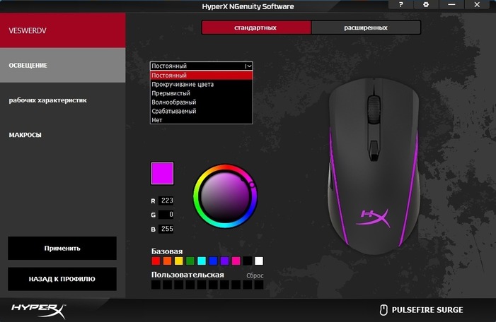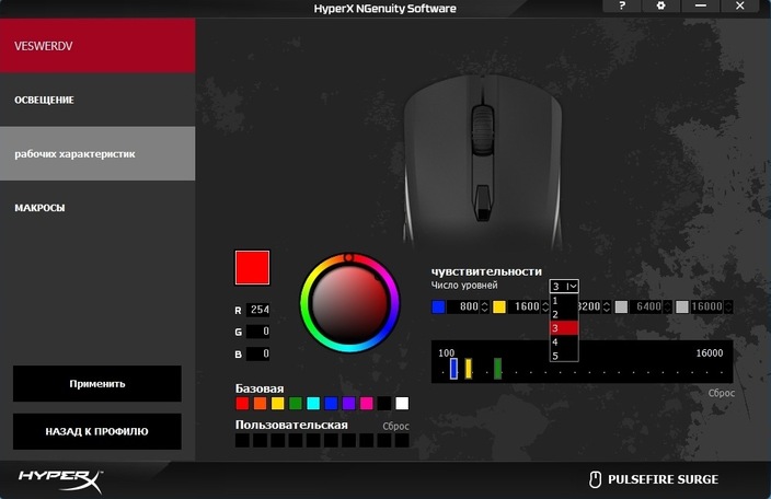 Что касается программного обеспечения, то Pulsefire Surge – это первая мышь в линейке, которая получила поддержку фирменного софта HyperX под названием «NGenuity Software». Программа интуитивно понятная и предоставляет геймеру полный комплект инструментов для персонализации настроек и параметров мышки. Помимо привычной настройки чувствительности от 100 до 16 000 dpi с шагом в 50 dpi, а также настройки профилей, записи макросов и переназначения клавиш, NGenuity Software преподносит некоторые сюрпризы. Например, при персонализации RGB-подсветки можно полностью настроить цвет, яркость и эффект свечения каждого из 32 светодиодов. Такого мы еще не видели ни в одной мышке.